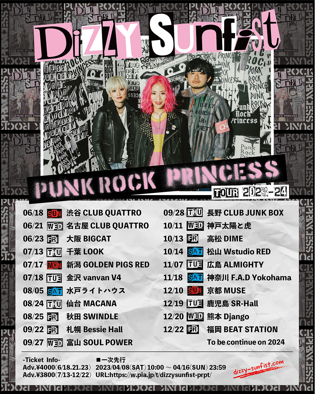 ACT Dizzy Sunfist / dustbox OPEN 18:30 START 19:00 TICKET 全自由¥3,800 ※入場時ドリンク代別¥600 ※未就学児童は入場可/チケット不要。小学生以上はチケット必要。 PLAYGUIDE ◆一次先行 受付期間:2023/4/8(土) 10:00~2023/4/16(日) 23:59 https://t.pia.jp/pia/event/event.do?eventCd=2313402 INFORMATION GIPお問い合わせフォーム:https://www.gip-web.co.jp/t/info